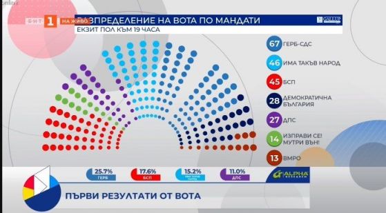 Без затруднения в НС влиза дясната коалиция „Демократична България“, която печели близо 10% от гласовете и на финалната права дори може да изпревари ДПС. В София първа политическа сила е „Демократична България“ с близо 30% от вота на столичани. Следват ГЕРБ с 19% от вота и Има такъв народ с 13%, БСП събира 12 %, според екзит пола на „Галъп интернешънъл“.